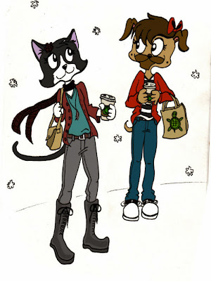 Muffin the cat and Greta, getting some Starbucks on a snowy day.